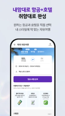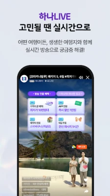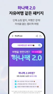 하나팩 2.0은 획일적인 단체 쇼핑 없이, 오직 풍성한 경험만을 추구하는 새로운 패키지 여행의 기준을 제시합니다. 또한, 여행 전문가들이 직접 생생한 현지 소식을 전하는 '하나LIVE'를 통해 실시간으로 소통하며 꿈꾸던 여행지에 대한 궁금증을 해소하고 영감을 얻을 수 있습니다. 나만의 취향에 맞춰 항공편과 호텔을 자유롭게 조합하는 맞춤형 여정 설계로 세상에 단 하나뿐인 자유여행을 완성해보세요.