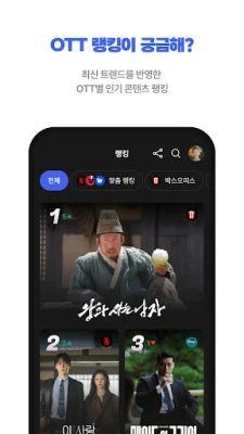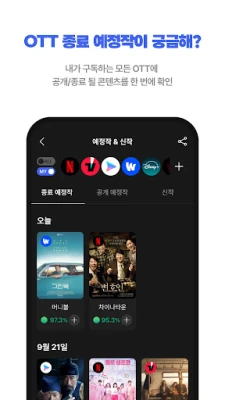 매일 쏟아지는 신작의 홍수 속에서 내 취향에 맞는 작품만 쏙쏙 골라보고 싶다면, 키노라이츠가 도와드립니다. 구독 중인 OTT 서비스를 선택하여 개인화된 신작 업데이트 목록을 날짜별로 편리하게 확인하고, 곧 서비스가 종료될 예정인 작품들 또한 미리 파악하여 아쉽게 놓치는 일이 없도록 관리하세요. 더 이상 여러 앱을 번갈아 가며 확인할 필요 없이, 키노라이츠 하나로 모든 업데이트 소식을 빠르게 받아보며 당신의 시청 목록을 효율적으로 채워나갈 수 있습니다.